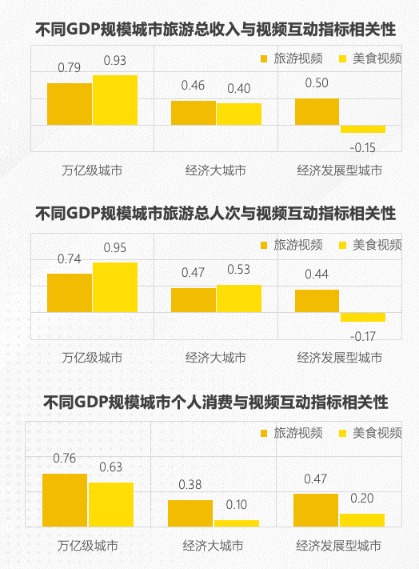 基于相关性分析,结果显示视频互动指标对不同GDP规模城市的影响存在明显差异。在万亿级城市,美食视频对旅游总收入(相关系数高达0.93)和旅游总人次(相关系数0.95)的影响极为显著,而旅游视频对个人消费(相关系数0.76)影响更大。相比之下,经济发展型城市和经济大城市则主要受旅游视频影响,相关系数分别为0.50和0.46(对旅游总收入的影响)。