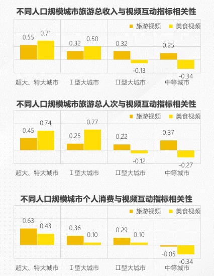 按照人口规模划分,视频互动指标对不同人口规模类型城市的影响也存在明显差异。在超大、特大城市,美食视频对旅游总收入(相关系数0.71)和旅游总人次(相关系数0.74)的影响较大,而旅游视频对个人消费(相关系数0.63)影响更显著。类似地,在Ⅰ型大城市,美食视频对旅游总人次的影响显著(相关系数0.77)。